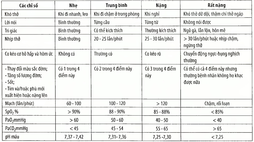 Mức độ đe dọa tính mạng: Đợt cấp có suy hô hấp với tăng CO2 máu, mất bù, kèm tình trạng toan máu, PaO2 < 60 mmHg, PaCO2 > 45 mmHg, và pH < 7,35.